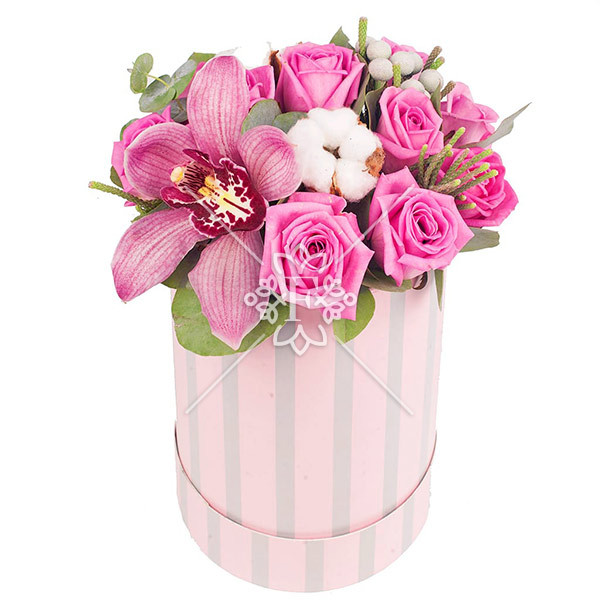 роза розовая - 10 шт., орхидея сиреневая – 1 шт., зелень декоративная, эвкалипт, хлопок, оазис, коробка (цвет и форма могут отличаться от изображения).